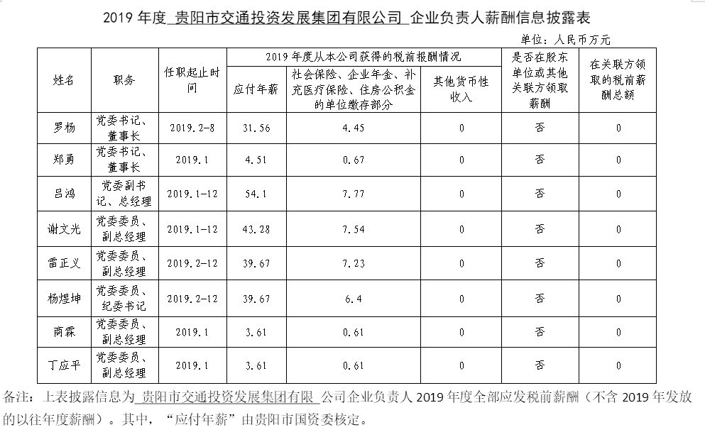 根據(jù)中央及省、市薪改意見精神,按照《貴陽市國(guó)資委監(jiān)管企業(yè)工資總額預(yù)算管理暫行辦法》(筑國(guó)資通〔2020〕75號(hào))、《貴陽市國(guó)資委監(jiān)管企業(yè)負(fù)責(zé)人薪酬管理辦法》(筑國(guó)資通〔2017〕199號(hào))、《貴陽市國(guó)資委關(guān)于印發(fā)2019年度企業(yè)負(fù)責(zé)人經(jīng)營(yíng)業(yè)績(jī)考核兌現(xiàn)結(jié)果的通知》(筑國(guó)資分配〔2020〕12號(hào))等有關(guān)規(guī)定,現(xiàn)將貴陽市交通投資發(fā)展集團(tuán)有限公司2019年度職工工資總額及企業(yè)負(fù)責(zé)人薪酬情況向社會(huì)予以公示: